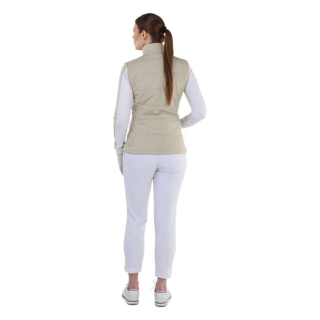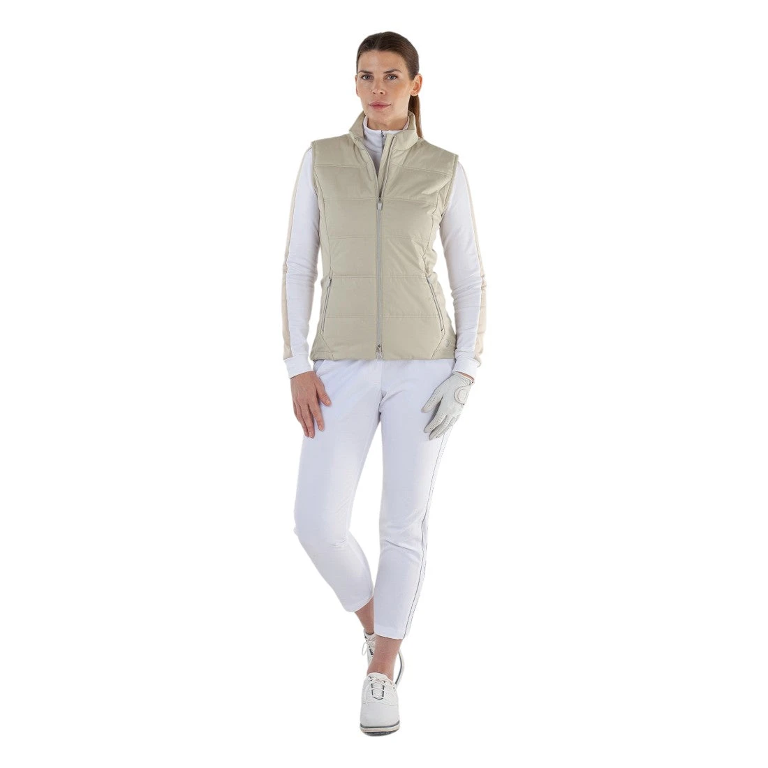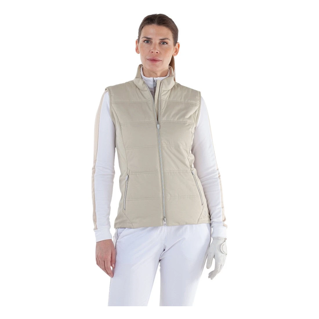 The Galvin Green Ladies Luna Windproof Golf Vest combines advanced materials and thoughtful design for optimal performance on the course. Crafted from recycled polyester with stretch and water-repellent properties, it offers reliable windproof protection and breathability. Featuring Thermore® padding and bluesign® approved fabrics, this INTERFACE-1™ vest provides warmth rated at Warming Effect #3. Practical elements such as front pockets, a two-way zipper, an adjustable elastic hem, and repositioned side seams ensure a tailored fit and unrestricted movement, making it an essential layer for any golfer seeking comfort and versatility in varying weather conditions.