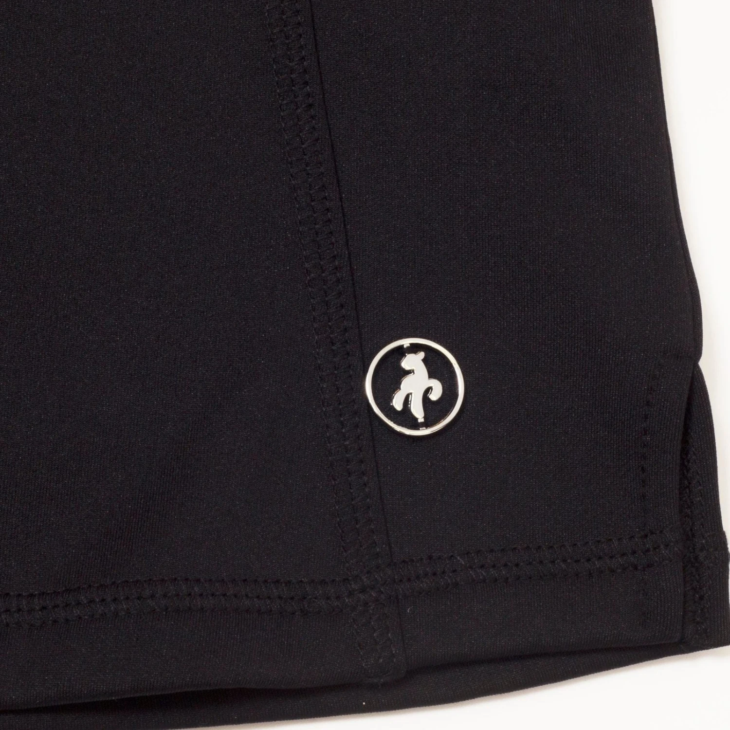 - Silver metal Lamb logo plaque on front left above hem