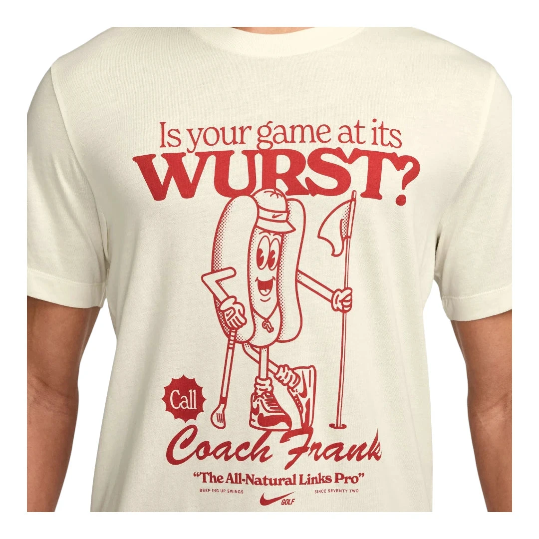 Celebrate the essential mid-round ritual with the Nike Coach Frank Golf T-Shirt. Crafted from 100% soft cotton, this tee offers breathable comfort to keep you focused and energized on the course. Designed for serious golfers, it pays tribute to the classic hotdog snack that fuels your game through the back nine. Durable and stylish, it’s the perfect addition to your golf wardrobe.