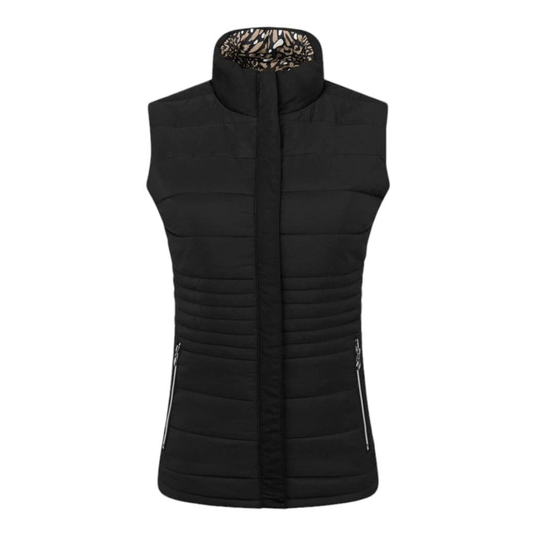 The Pure Golf Ladies Eve Reversible Gilet PG-48406 is the perfect addition to your golf wardrobe. This insulated, winter-weight gilet is quick-dry and features a flattering quilting style and fit that enhances your silhouette. With the Wild Truffle print on one side and black on the other, it offers versatility of wear. The two-way zippers and pockets on both sides add convenience.